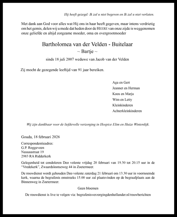 Bartholomea van der Velden - Buitelaar Afbeelding * Waddinxveen 7 oktober 1934 † Gouda 18 februari 2026 Rouwdienst 📅 21 februari 2026 - 13:30 📄 Liturgie Orde van dienst rouwdienst mevrouw van der Velden - Buitelaar 🎥 Videostream Rouwdienst en gesproken woorden aan het graf You must have JavaScript enabled to use this form. Uw condoleance Deze condoleance en persoonlijke gegevens zullen verstrekt worden aan de nabestaanden. Naam Adres Postcode Woonplaats E-mail adres Uw bericht Verzenden
