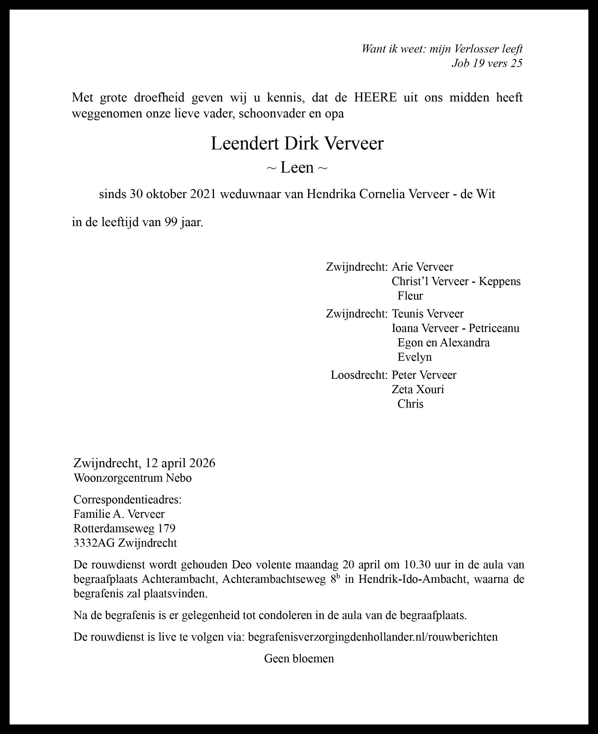 De heer L.D. Verveer Afbeelding * Hendrik-Ido-Ambacht 26 mei 1926 † Zwijndrecht 12 April 2026 Rouwdienst 📅 20 April 2026 - 10:30 🎥 Videostream Rouwdienst live volgen You must have JavaScript enabled to use this form. Uw condoleance Deze condoleance en persoonlijke gegevens zullen verstrekt worden aan de nabestaanden. Naam Adres Postcode Woonplaats E-mail adres Uw bericht Verzenden