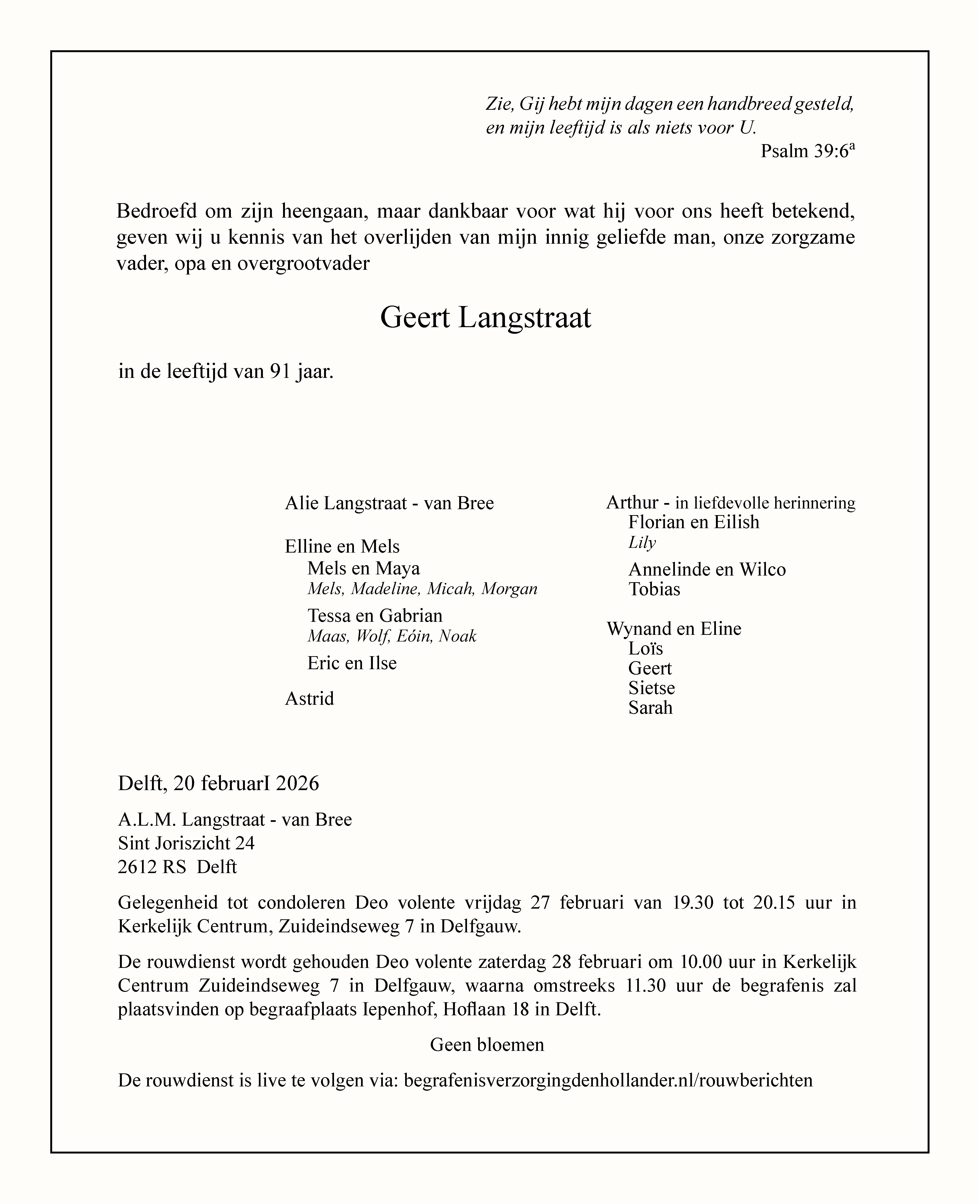 Geert Langstraat Afbeelding * Schipluiden 11 juni 1934 † Delft 20 februari 2026 Rouwdienst 📅 28 februari 2026 - 10:00 🎥 Videostream Rouwdienst Geert Langstraat You must have JavaScript enabled to use this form. Uw condoleance Deze condoleance en persoonlijke gegevens zullen verstrekt worden aan de nabestaanden. Naam Adres Postcode Woonplaats E-mail adres Uw bericht Verzenden
