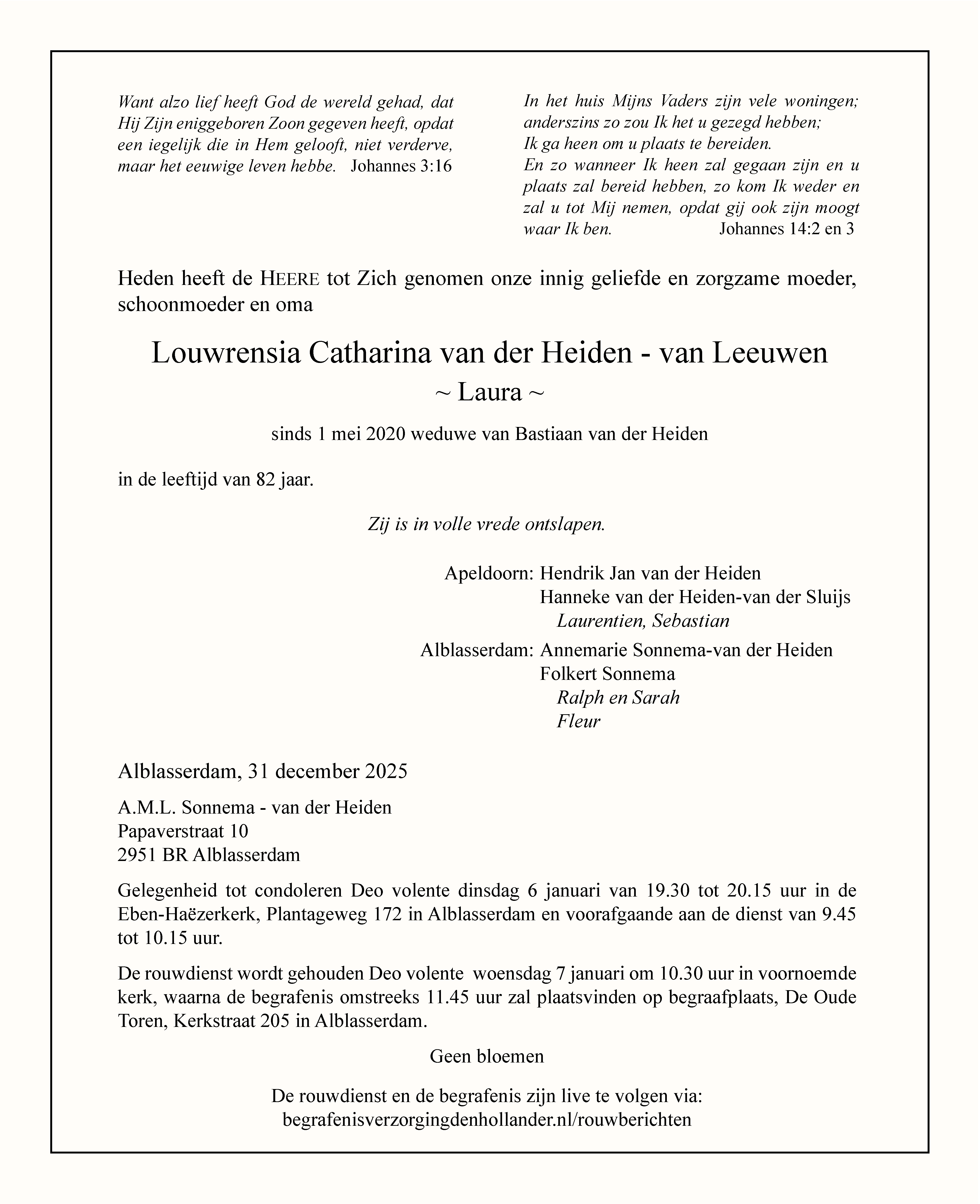 Gegevens begrafenis mevrouw Louwrensia Catharina van der Heiden - van Leeuwen