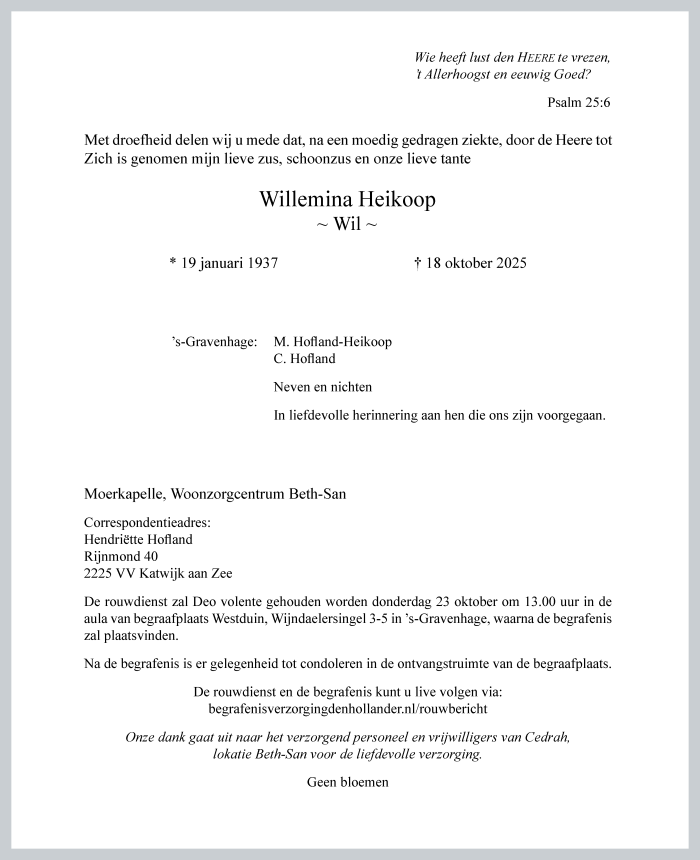 Klik hier om de dienst te volgen Klik hier om de begrafenis te volgen You must have JavaScript enabled to use this form. Plaats hier uw condoleance. Deze condoleance en persoonlijke gegevens zullen verstrekt worden aan de nabestaanden. Naam Adres Postcode Woonplaats E-mail adres Uw bericht