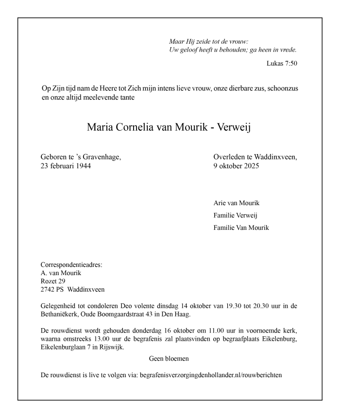Deze condoleance en persoonlijke gegevens zullen verstrekt worden aan de nabestaanden.