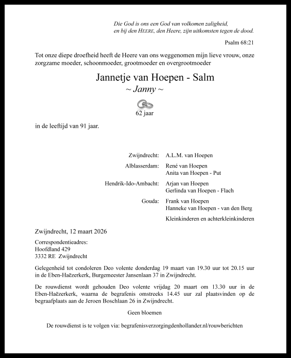 Jannetje van Hoepen - Salm Afbeelding * Yerseke 29 januari 1935 † Zwijndrecht 12 maart 2026 Rouwdienst 📅 20 maart 2026 - 12:30 🎥 Videostream Rouwdienst mevrouw J. van Hoepen - Salm You must have JavaScript enabled to use this form. Uw condoleance Deze condoleance en persoonlijke gegevens zullen verstrekt worden aan de nabestaanden. Naam Adres Postcode Woonplaats E-mail adres Uw bericht Verzenden