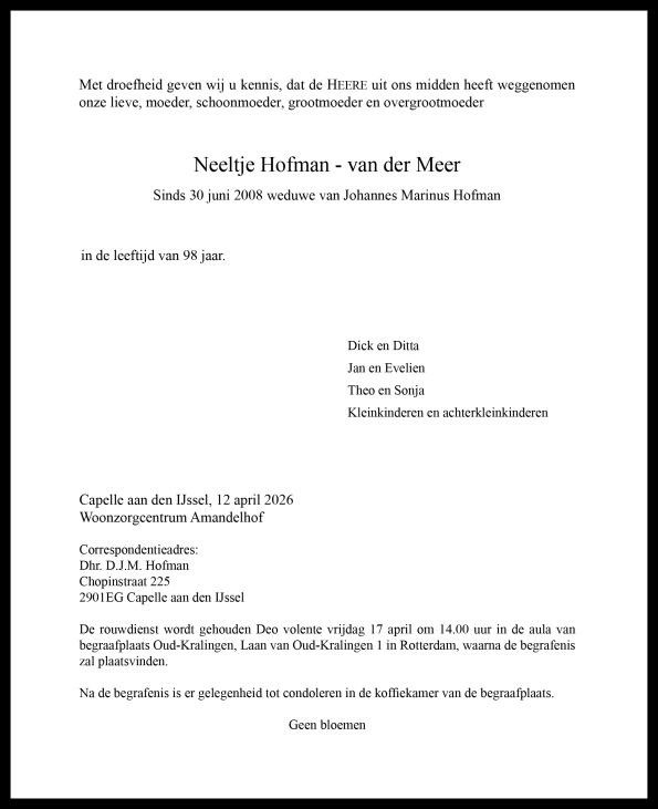 Mevrouw N. Hofman - van der Meer Afbeelding * Rotterdam 10 juli 1927 † Capelle aan den IJssel 12 April 2026 Rouwdienst 📅 17 April 2026 - 14:00 📄 Liturgie Orde van dienst 📺 Audio uitzending Rouwdienst live You must have JavaScript enabled to use this form. Uw condoleance Deze condoleance en persoonlijke gegevens zullen verstrekt worden aan de nabestaanden. Naam Adres Postcode Woonplaats E-mail adres Uw bericht Verzenden
