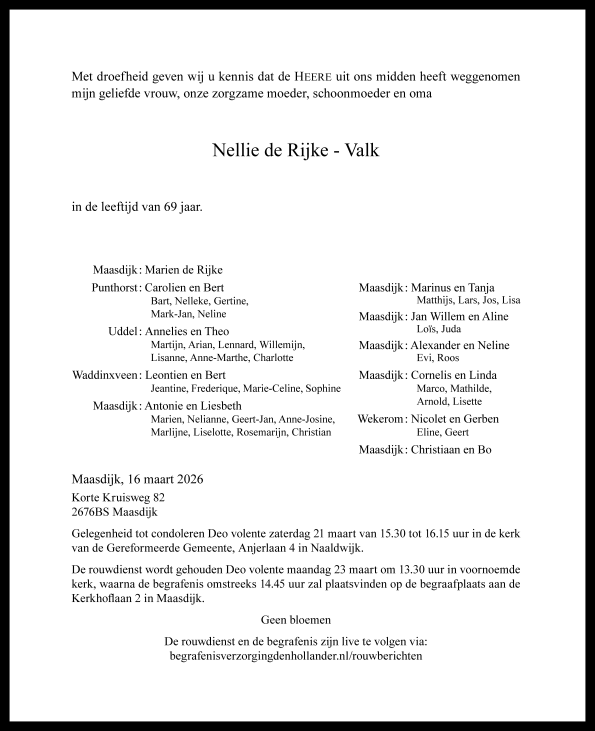 Nellie de Rijke - Valk Afbeelding * De Lier 17 April 1956 † Maasdijk 16 maart 2026 Rouwdienst 📅 23 maart 2026 - 13:30 🎥 Videostream rouwdienst Nellie de Rijke - Valk You must have JavaScript enabled to use this form. Uw condoleance Deze condoleance en persoonlijke gegevens zullen verstrekt worden aan de nabestaanden. Naam Adres Postcode Woonplaats E-mail adres Uw bericht Verzenden